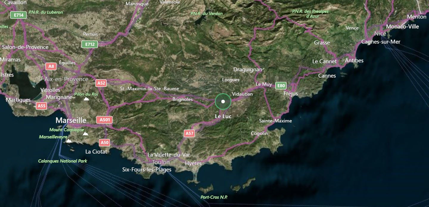 Auf halbem Weg zwischen Nizza und Marseille, in der Nähe der Autobahn A8, sind alle Orte der französischen Riviera und der südlichen Provence schnell zu erreichen. Zwei internationale Flughäfen sind nur eine Stunde entfernt: Nizza/Côte d'Azur (NCE) und Marseille/Provence (MRS). Bis zum nächsten TGV-Bahnhof, Les Arcs/Draguignan, sind es nur 18 km. Mit dem Eurostar und dem deutschen ICE kommst du am Bahnhof Aix-en-Provence/TGV an.